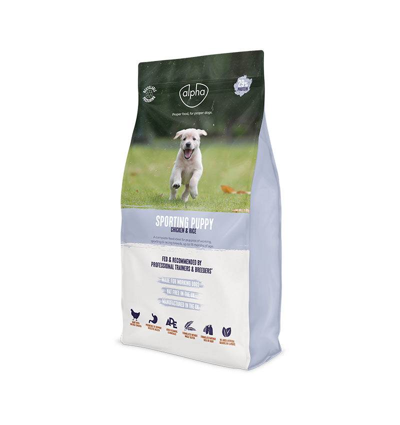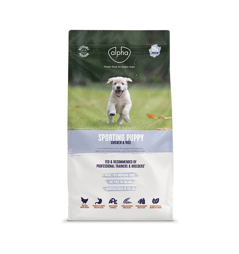FUEL THEIR POTENTIAL with Alpha Sporting Puppy food, a complete feed ideal for puppies of working, sporting & racing breeds, up to 18 months of age.