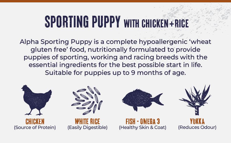 Alpha Sporting Puppy food is a hypoallergenic diet, formulated without wheat gluten, using quality ingredients to give your puppy the best possible start in life. It is high in protein for growth and development as well as containing linseed to help maintain skin & coat condition.