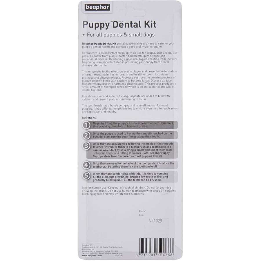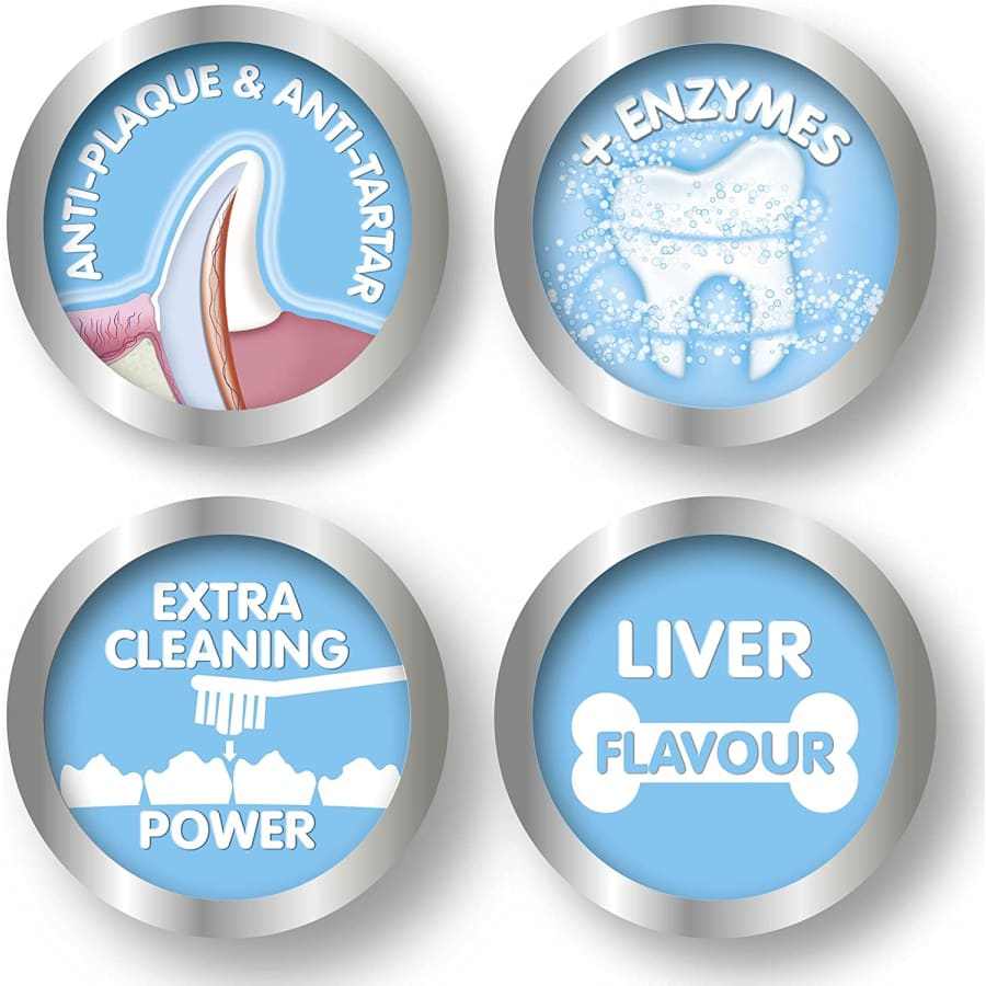 This pack contains liver flavoured toothpaste to counteract plaque and prevent the formation of tartar, and a small toothbrush with nylon bristles designed to fit little mouths and to facilitate access to hard to reach areas.