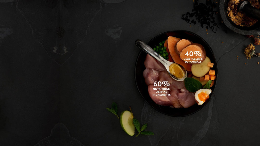 Full Composition Freshly Prepared Deboned Chicken (26%), Dried Chicken (25%), Sweet Potato, Peas, Potato, Pea Protein, Alfalfa, Chicken Fat (3.1%), Dried Egg (3.1%), Chicken Gravy (1.6%), Salmon Oil (1.2%), Minerals, Vitamins, Glucosamine (1000 mg/kg), MSM (1000 mg/kg), Apple, Carrot, Spinach, Psyllium, Fructooligosaccharides, Chondroitin (700 mg/kg), Camomile, Peppermint, Marigold, Cranberry, Aniseed, and Fenugreek.