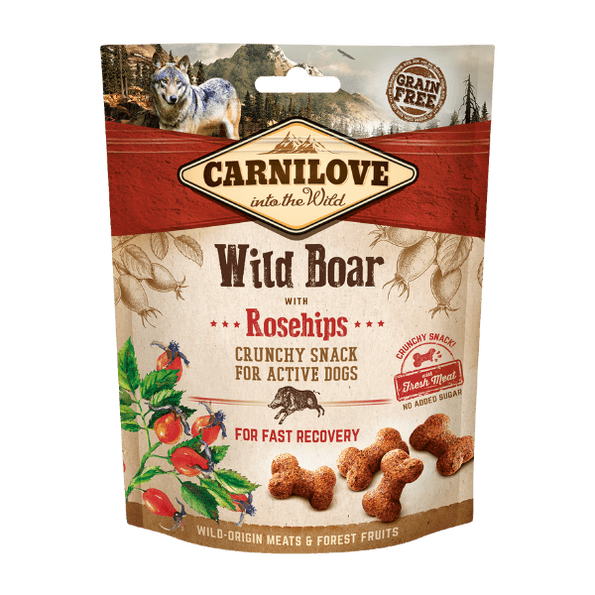 Carnilove Wild Boar with Rosehips Crunchy Dog Treats are a delicious complementary snack for dogs of all breeds and life stages. Made with 50% wild boar and fresh meat, these crunchy dog treats deliver a rich, natural flavour inspired by a dog’s ancestral diet.