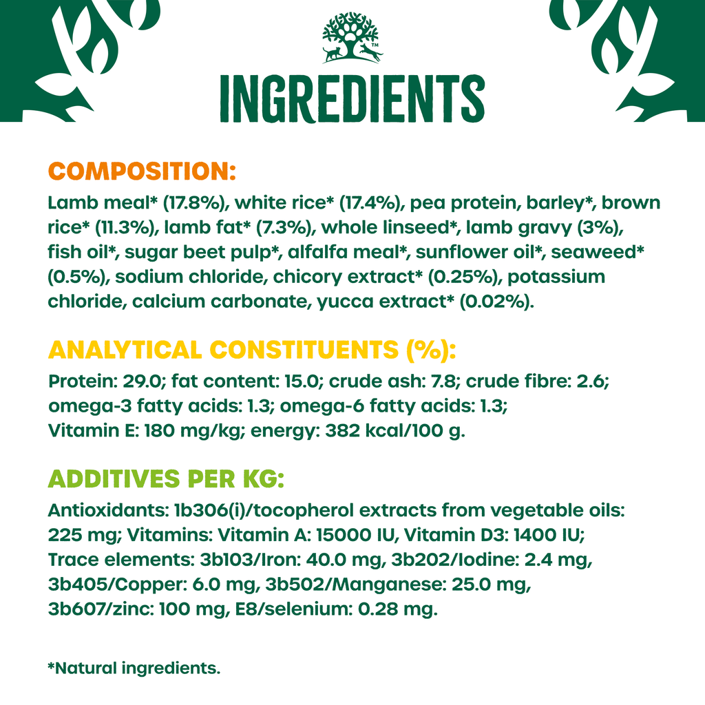 Lamb meal (17.8%), white rice (17.4%), pea protein, barley, brown rice (11.3%), lamb fat (7.3%), whole linseed, lamb gravy (3%), fish oil, sugar beet pulp, alfalfa meal, sunflower oil, seaweed, sodium chloride, chicory extract (0.25%), potassium chloride, calcium carbonate, yucca extract (0.02%).