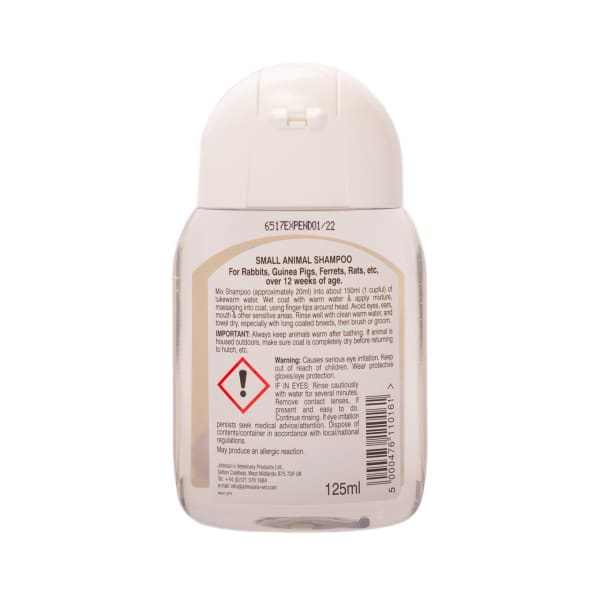 Johnson's Small Animal 125ml Shampoo is a deodorising shampoo which is a mild, non-irritant shampoo for small animal's such as rabbits, guinea pigs and ferrets.